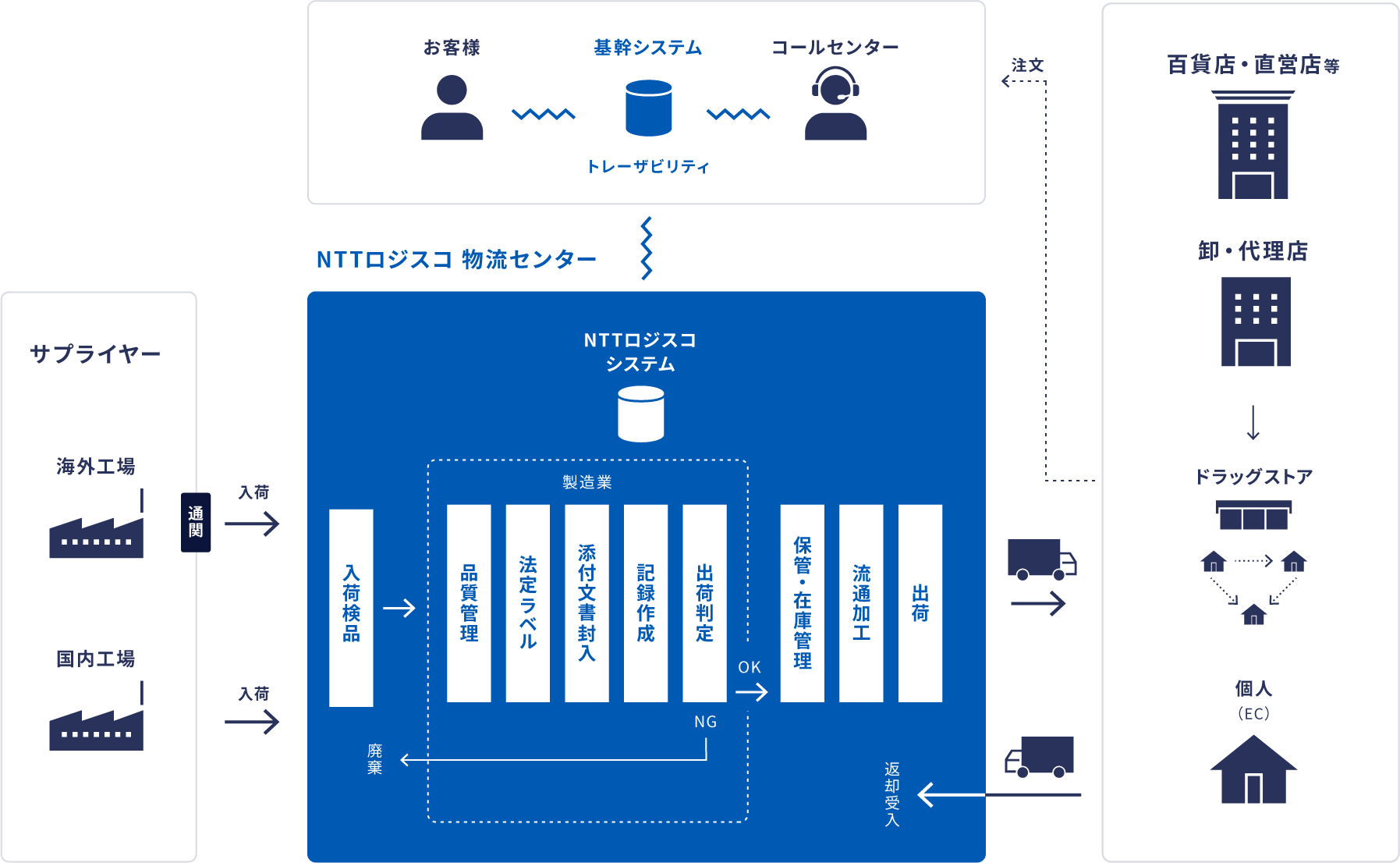 輸出入フォワーディング、入荷検品、検品・ラベリング(法定ラベル貼付)、添付文書封入、セット組み、ピッキング、納品書印刷、ギフトラッピング、出荷、返品、配送